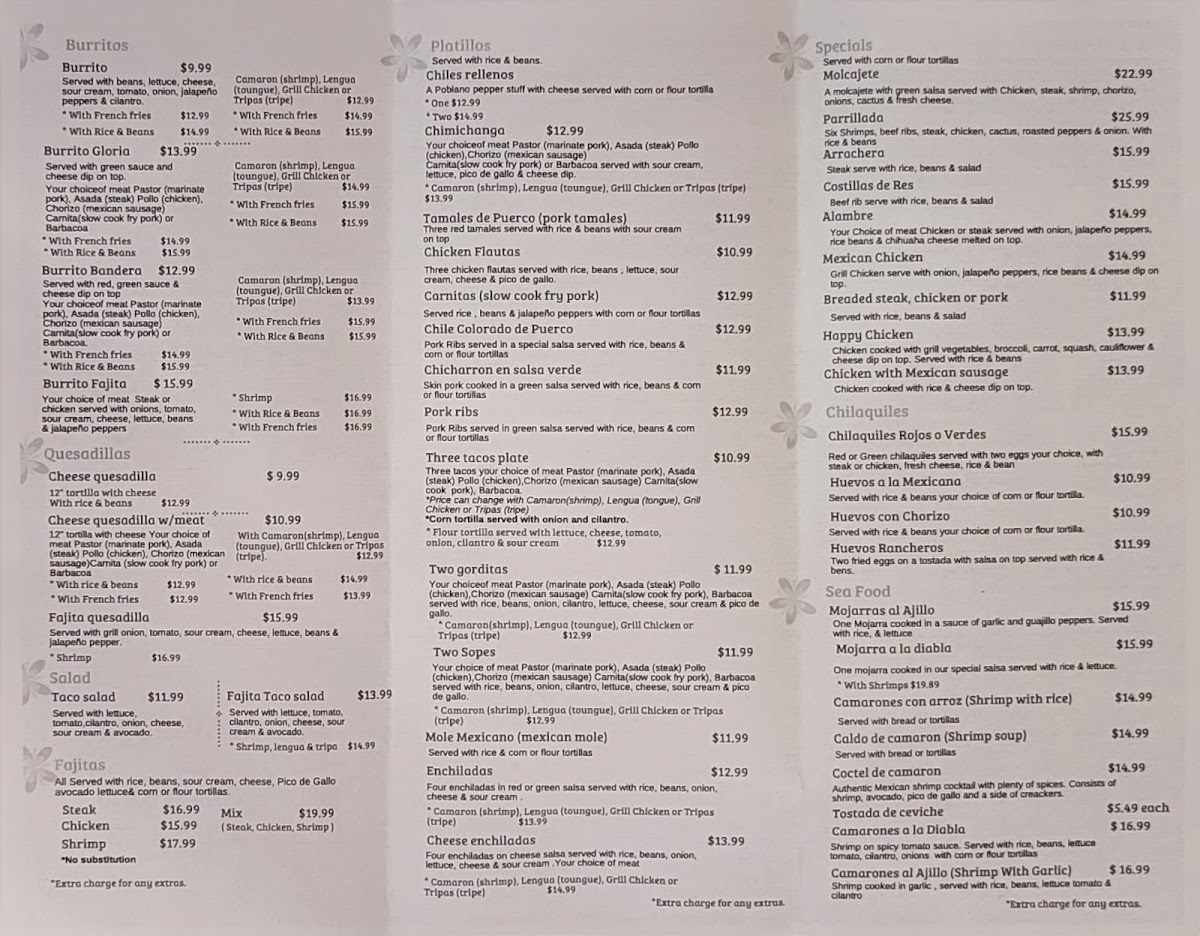 This menu truly reflects the richness of Mexican cuisine, combining traditional favorites, seafood delights, and creative specials in a way that appeals to both casual diners and devoted food enthusiasts alike.