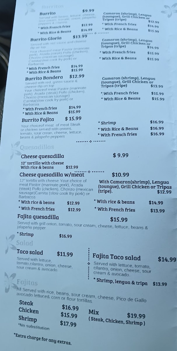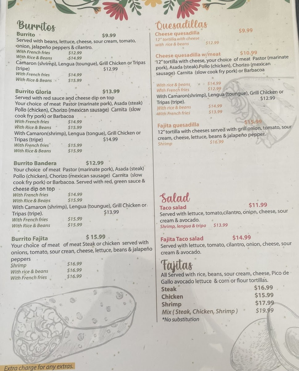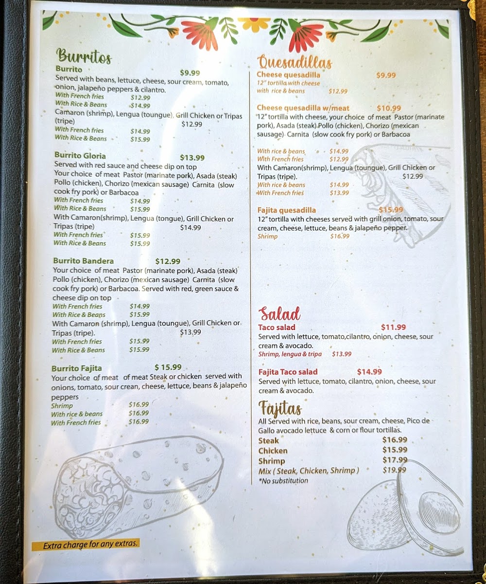 Fajitas like Fajita De Pollo / Chicken Fajita, Fajita De Asada / Steak Fajita, and Fajitas De Camarón / Shrimp Fajita are complemented by burritos, nachos, tacos, and customizable taco salads. The specials menu highlights Arrachera / Skirt Steak, Pollo Mexicano / Mexican Chicken, and Pollo Feliz / Happy Chicken, while beverages such as Soda De La Fuente / Fountain Soda, Aguas Frescas / Fresh Flavored Waters, and Sodas Mexicanas / Mexican Sodas round out a menu that is both extensive and thoughtfully curated, making every visit to Doña Gloria a flavorful adventure.