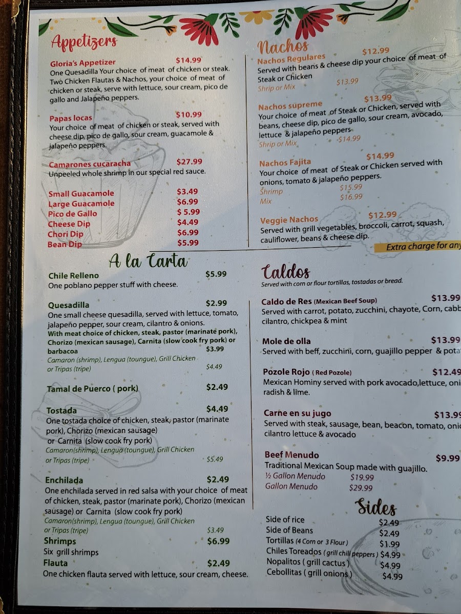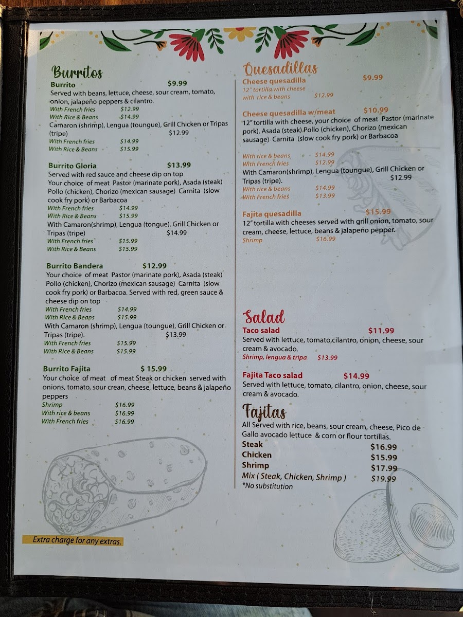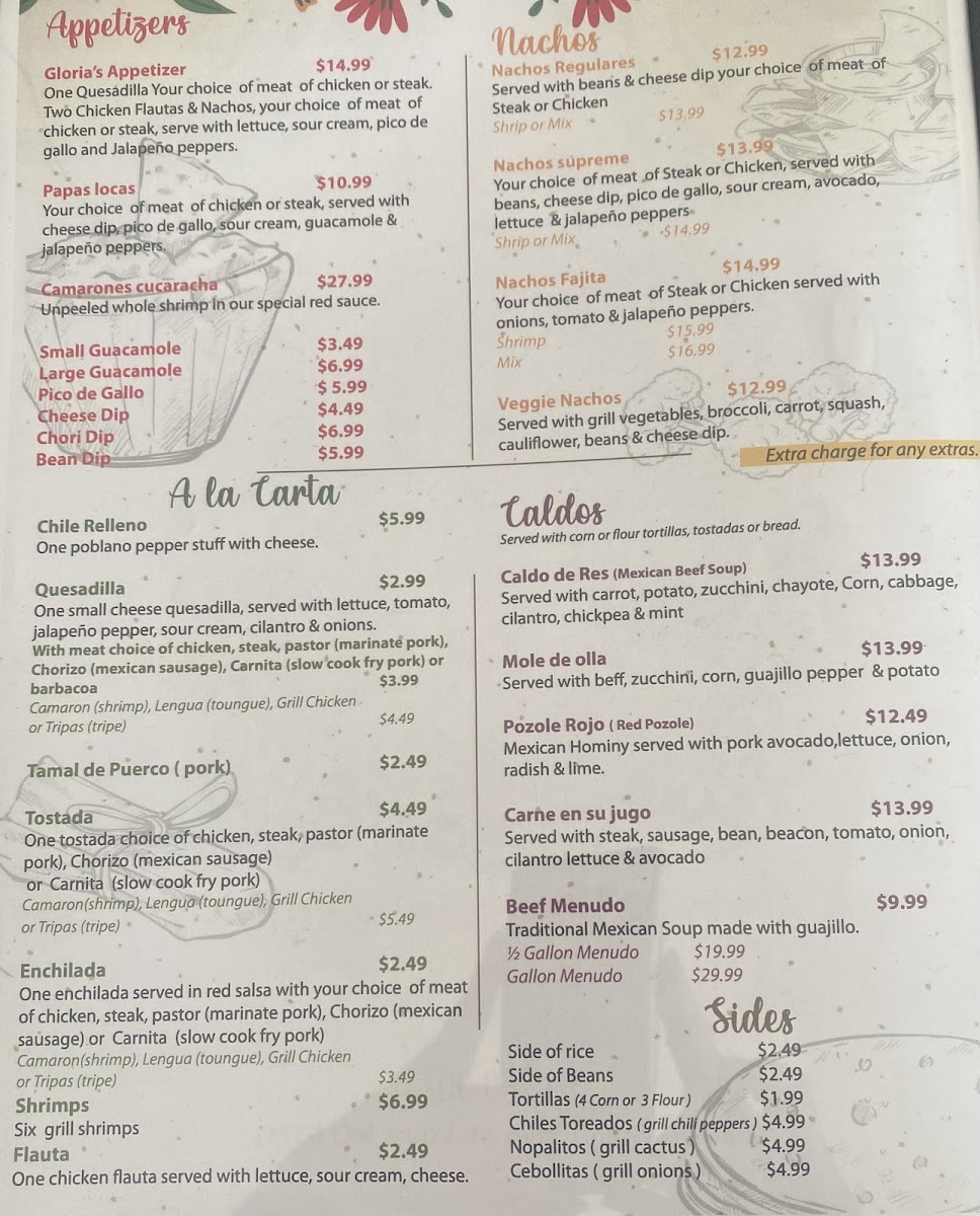 Fajitas like Fajita De Pollo / Chicken Fajita, Fajita De Asada / Steak Fajita, and Fajitas De Camarón / Shrimp Fajita are complemented by burritos, nachos, tacos, and customizable taco salads. The specials menu highlights Arrachera / Skirt Steak, Pollo Mexicano / Mexican Chicken, and Pollo Feliz / Happy Chicken, while beverages such as Soda De La Fuente / Fountain Soda, Aguas Frescas / Fresh Flavored Waters, and Sodas Mexicanas / Mexican Sodas round out a menu that is both extensive and thoughtfully curated, making every visit to Doña Gloria a flavorful adventure.