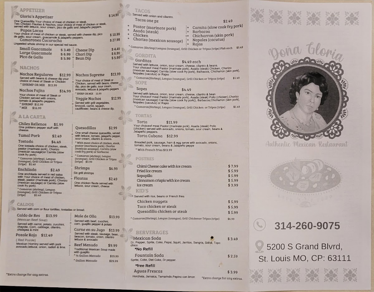 Doña Gloria’s menu at 5200 S Grand Blvd in St. Louis is a vibrant celebration of traditional Mexican flavors, offering something for every palate. Among the platillos, highlights include Pollo Con Arroz/Chicken With Rice, Plato De Chiles Rellenos, and Chile Colorado De Puerco / Colorado Pork Chili, alongside heartier options like Costillas De Puerco / Pork Ribs and Chicharrón En Salsa Verde / Fried Pork Rind In Green Sauce. The a la carte section features staples like Quesadilla, Camarones / Shrimp, Enchilada, Tamal De Puerco / Pork Tamale, and Tostada, while DoorDash patrons can enjoy inventive offerings such as “DoorDash” Special Combo #3 Tamal, Quesabirria, Flauta, Ostiones En Su Concha and DoorDash Special Combo GLORIA COMBO Mariscos Mix.