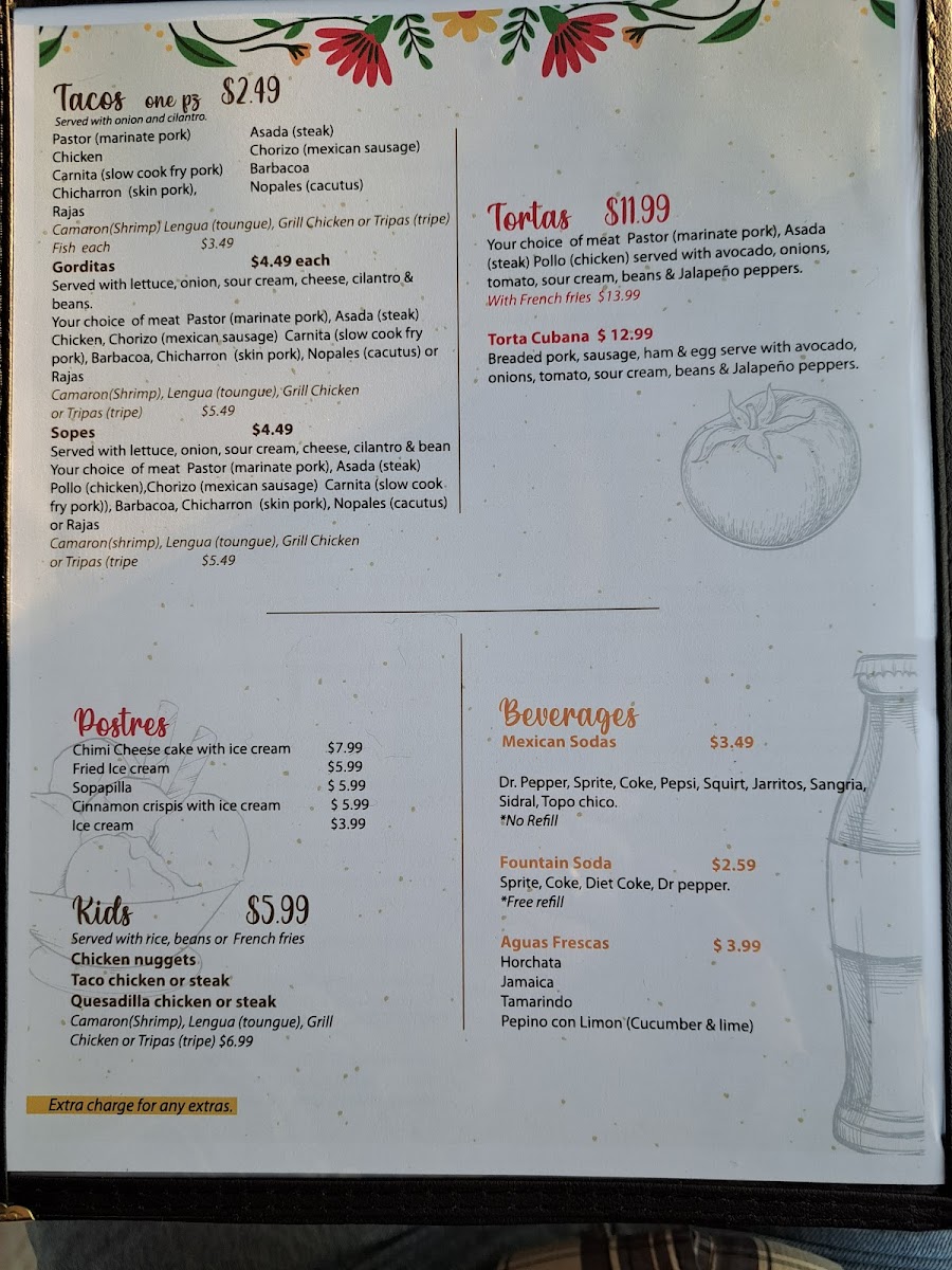 For those seeking lighter fare, sides like Chiles Toreados / Grill Chili Peppers, Acompañante De Arroz / Side Of Rice, Nopalitos / Grilled Cactus, and Orden De Chips / Order Of Tortilla Chips complement dishes beautifully. Tortas include the indulgent Torta De Chilaquil, Torta Cubana / Cuban Torta, and Pambazo Tortas, while appetizers such as Aderezo De Queso / Cheese Dip, Aderezo De Chorizo Con Queso / Chori Dip, and Camarones Cucaracha / Shrimp In Buttery Hot Sauce showcase the kitchen’s bold flavors. Chilaquiles options like Huevos A La Mexicana / Mexican Style Eggs and Chilaquiles Rojos O Verdes / Red Or Green Chilaquiles balance richness with tradition.